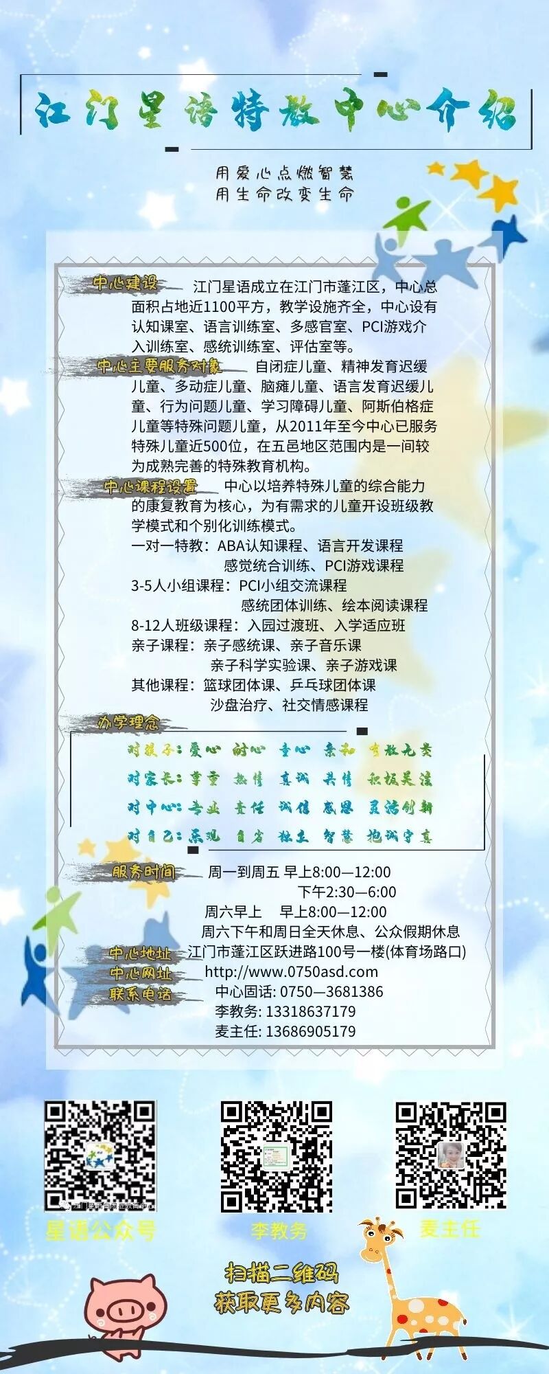 异常行为这么多 听有的家长说,自己家的特殊小朋友常常有很多奇奇怪怪的坏毛病,改不过来,没有一点办法,一点办法都没有。比如不会控制力度,容易摔坏东西或伤到自己或别人;跑起来不会控制速度,看见有人也不会停下,直接撞,跑来跑去跑个没完;爱玩转圈圈类型的动作,怎么转都不晕;走路走不好,平衡感较差,容易摔跤,东倒西歪,经常碰撞东西·················· 实际上,无论是特殊儿童还是普通儿童,因为感觉统合失调,所以才会出现各种小状况。 越来越广为人知的感统失调 现在随着知识的传播和获取越来越广泛、简便,很多有小朋友的家长,特别是家里有特殊小朋友的家长,渐渐都知道什么是感统(感觉统合)失调了。 感觉统合是指个体对进入大脑的各种感觉刺激信息(视觉、听觉、嗅觉、触觉等),在中枢神经系统中进行加工处理形成有效的组合过程。即个体在特定的环境内有效地利用自己身体各部分的感觉器官,从环境中获得不同感觉通路的信息并输入大脑,大脑对输入信息进行加工处理(包括:解释、比较、增强、抑制、联系、统一),并作出适应性反应的能力。 感统失调症是感觉统合失调(Sensory Integrative Dysfunction)的简称,又称为“神经运动机能不全症”(Neurobehavioral Dysfunction),是一种中枢神经系统的障碍问题,是指外部进入大脑的各种感觉刺激信息不能在中枢神经系统内形成有效的组合,使机体不能和谐的运作而产生的一种缺陷。 感觉统合失调的临床表现可分为:本体感觉失调、前庭感觉失调、视觉系统失调、听觉系统失调,以及触觉系统失调。本体感觉失调又分为左右脑平衡失调和动作协调不良,前庭感觉失调又分为前庭平衡失调和前庭网膜失调,触觉系统失调又分为触觉过分敏感或过分迟钝。 在普通儿童中感觉统合失调的临床表现主要为学习障碍,例如 1. 在读、写、算方面记忆力差。 2. 写字常常多一笔、少一划、部首张冠李戴、左右颠倒。 3. 写字是看一眼、写一笔,做作业的时间拖得长。 4. 运动技巧差,动作协调差。 5. 阅读时常常出现増字、漏字、前后颠倒、跳行等现象,或者存在速度过快、过慢、停顿次数过多等问题。 在现实中,人们通过感觉系统来感知认识世界,精神系统在获得感官系统传递来的信息后,对这些信息做出即时的处理,过滤或屏蔽不重要的信息、组织有用的信息,然后通过大脑指导人的情绪和行动。可以说人的全身布满了信息,尤其是手和脚。大部分时候,这些信息都是自动处理的,并不需要经过思考的过程。然而孤独症患者有很多存在感官信息处理方面的障碍,对于某种感官刺激过于敏感,而对另一些又不够敏感,并且有可能无法同时处理所有的感官刺激信息:该屏蔽的没有屏蔽掉,而该优先处理的又没有被处理。在这种情况下,他们所感知的世界变得十分复杂,让其觉得无所适从。 感觉系统低敏:是指孩子感受或意识不到正常水平的感官刺激,他们需要更大的刺激来触发神经系统。在这种情况下,他们可能会通过某种特定的活动来寻找这种刺激,从而造成了行为过度。比如,孩子始终处于活蹦乱跳的活动状态、甩手、晃动身体。 感觉系统过敏:是指神经系统对于某些感官刺激过度敏感,只是很小的刺激就可能会让孩子感觉到刺激的过度,从而变得难以承受。在这种情况下,他们会通过行为来逃避这些刺激。比如,不喜欢被碰触、不能忍受噪音、踮脚尖走路。 星语感觉统合干预课程 感觉统合课程介绍 通过七大感知觉(视、听、动、嗅、味、触、前庭、本体),在环境内有效利用儿童感官以不同的感觉通路,从环境中获取信息,输入大脑,大脑再对信息进行加工处理(包括解释、比较、增强、抑制、联系、统一),并作出适当性的反应能力。利用感觉统合器材及特教老师指导动作的要求,让孩子充分感知各种刺激,在大脑进行感觉统合处理信息,并作出适当的反应。感觉统合训练的本质是采取游戏形式,使孩子乐于接受,主动参与,同时进行游戏项目。在训练当中激发孩子对项目的兴趣,促使孩子在坚持运动协调的过程中掌握各种感知觉活动的整合。因此感觉统合训练不是刻板的单调训练,而是生动活泼,符合孩子的心理发展水平游戏训练。针对孩子感官失调的过敏或低敏,作出干预方案以及短、长期目标,有效地刺激其感官,从而提高感觉统合能力的发展。 感统训练一阶(1~3岁) :听从指令的能力、大动作模仿能力、唱数、触觉训练、前庭平衡觉训练、弹跳训练、固有平衡训练、本体感训练、学习正确的坐姿、解决各种走路姿势问题、学习正确的收拾玩具的习惯 感统训练二阶(3~5岁) :二步指令、精细动作模仿能力、触觉训练二阶、数数、前庭平衡觉训练二阶、弹跳训练二阶、固有平衡训练二阶、本体感训练二阶、学习各种常见运动及球类运动、基本社交礼仪、万象组合训练 感统训练三阶(5~7岁) :多步指令、触觉训练三阶、前庭平衡觉训练三阶、弹跳训练三阶、固有平衡训练三阶、本体感训练三阶、万象组合训练、各种基本运动及球类运动二阶 感觉统合课程介绍 1 一对一基础感统干预训练 “教学内容覆盖上述一、二、三阶基础内容,外加愿意听从指令、基础的延迟奖励、各大感觉系统的基础技能(坐好、立正、翻跟斗、骑脚踏车、跳高、跳远、跑、爬、旋转、注意看等等)” 教学样式: 2 一对二进阶感统干预训练 “教